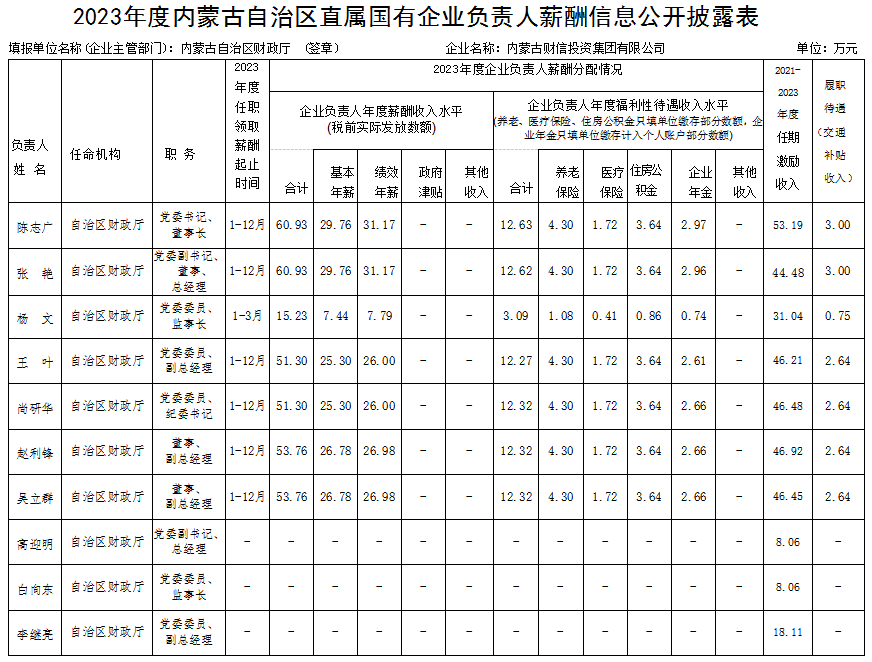 2023年度内蒙古自治区直属国有企业负责人薪酬信息公开披露表